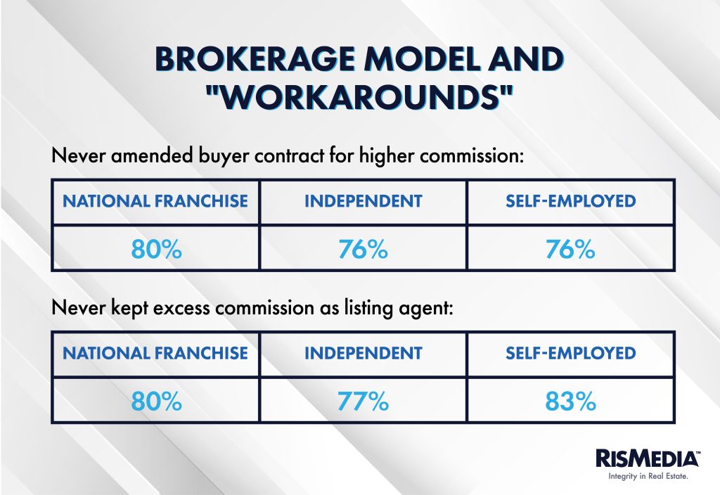 But also notable, these practices were utilized across brokerage models. In fact, “workarounds” were sometimes less common among self-employed or hybrid models, with 83% saying they never “hogged” commission.