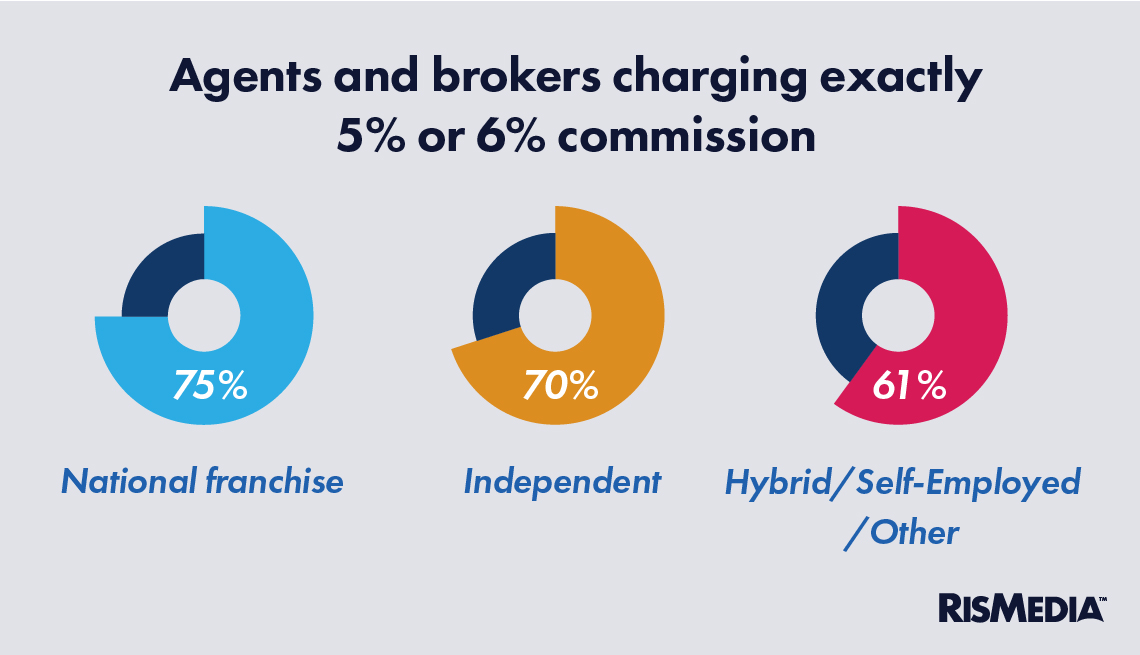 But the concentration of agents and brokers reporting commission at those exact 5% or 6% levels could be interpreted to mean that the industry is still structured to be less flexible or variable with market conditions. Regardless of brokerage affiliation and industry experience, around 70% of agents and brokers reported commissions at one of those two levels (though national franchises were slightly more likely to stick to 5% or 6%, with three-quarters of those agents saying they did, and hybrid/self-employed brokers and agents were less likely, at 61%).