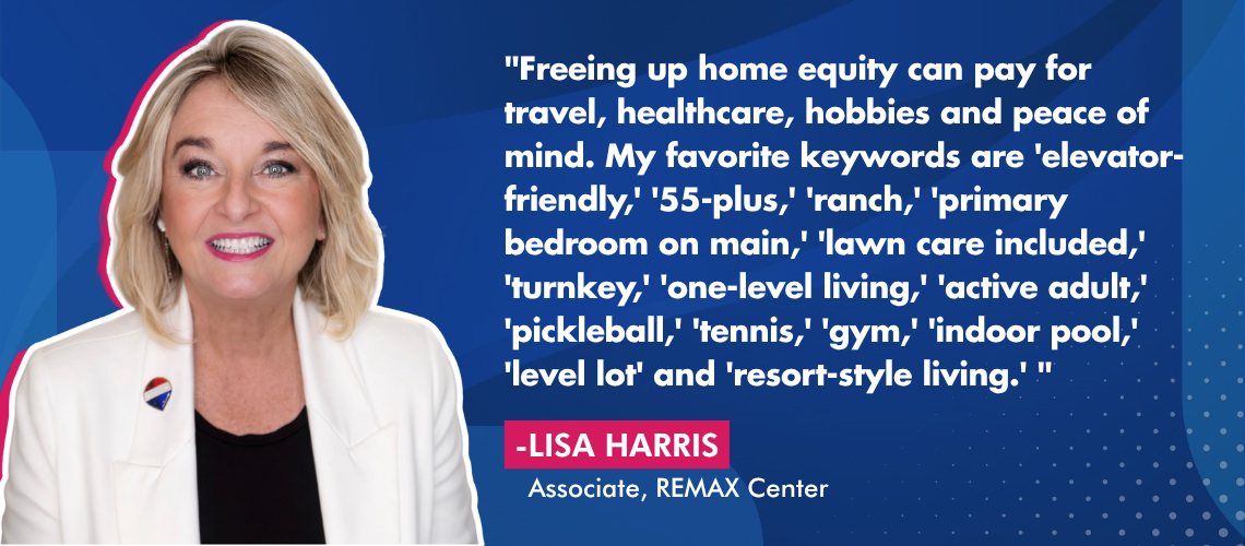 “Freeing up home equity can pay for travel, healthcare, hobbies and peace of mind,” she says. “My favorite keywords are ‘elevator-friendly,’ ‘55-plus,’ ‘ranch,’ ‘primary bedroom on main,’ ‘lawn care included,’ ‘turnkey, one-level living,’ ‘active adult,’ ‘pickleball,’ ‘tennis,’ ‘gym,’ ‘indoor pool,’ ‘level lot’ and ‘resort-style living.’”