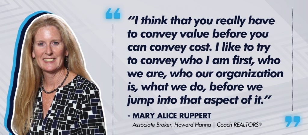 You also don’t want to structure your presentation or contract where the fee is shunted to the bottom (the NAR settlement already requires that it be “conspicuous,” without fully defining what that means). Mary Alice Ruppert, associate broker for Howard Hanna | Coach REALTORS®, says that naturally, compensation ends up “somewhere in the middle” of a discussion or contract.