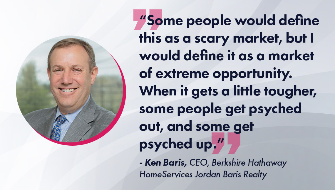 “Some people would define this as a scary market, but I would define it as a market of extreme opportunity,” says Ken Baris, CEO of Berkshire Hathaway HomeServices Jordan Baris Realty in Livingston, New Jersey. “We’ve exited a time where everyone has been rolling and almost making money in spite of ourselves. And now, when it gets a little tougher, some people get psyched out, and some get psyched up, and it does require making adjustments.