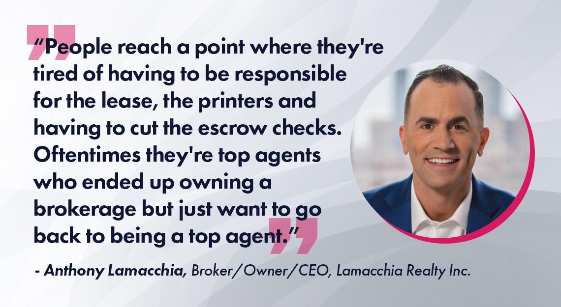 “People reach a point, particularly those that don’t scale their businesses, where they’re tired of having to be responsible for the lease, the printers, having to cut the escrow checks, and oftentimes, they’re top agents who ended up owning a brokerage but just want to go back to being a top agent,” he says. “Taking those stresses off of them and enabling them to go back to doing what most are very good at in the first place, which is selling homes and working with lots of clients, is usually the best angle.