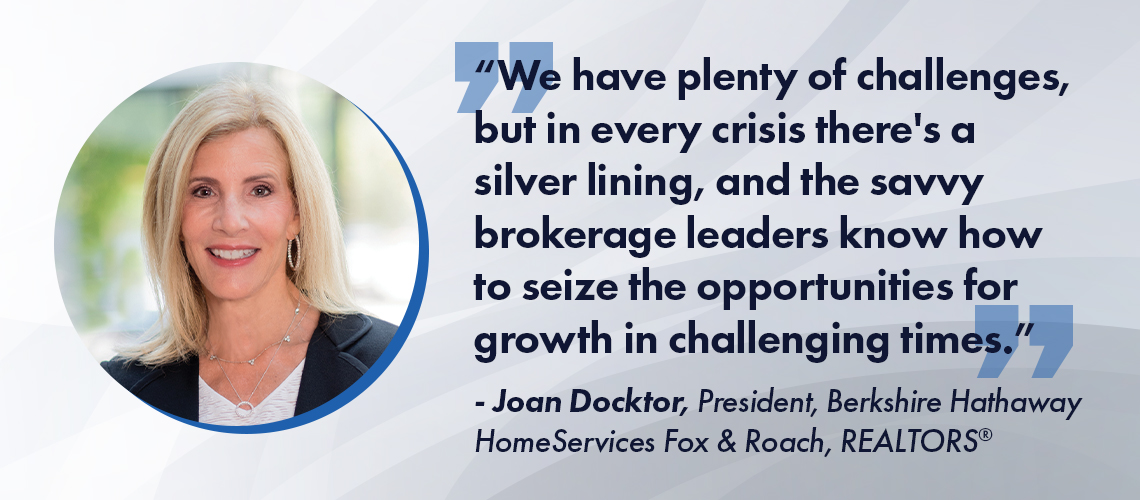 “We have plenty of challenges, but in every crisis there’s a silver lining, and the savvy brokerage leaders know how to seize the opportunities for growth in challenging times,” says Joan Docktor, president of Berkshire Hathaway HomeServices Fox & Roach, REALTORS® in Devon, Pennsylvania. “Anyone who has been in residential real estate for a number of years knows our business is cyclical, and that great brokers often grow in these times, and also grow their marketshare.”