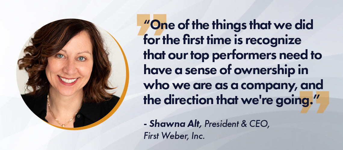 Shawna Alt, president and CEO of First Weber, Inc. in Madison, Wisconsin, explains that “our role now as leaders is to create moments, not meetings. We can get meeting information off the internet, off Google, but creating moments and things that bring us together that help reinforce team and culture is a No. 1 priority for us. One of the things that we did for the first time is recognize that our top performers need to have a sense of ownership in who we are as a company, and the direction that we’re going.