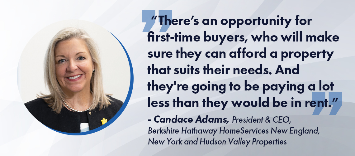 “I think we’re seeing a little bit more of a deliberate approach to buying real estate this year,” says Candace Adams, president and CEO of Berkshire Hathaway HomeServices New England, New York and Hudson Valley Properties. “I think the buyer will be a digital buyer, since 80% of first-time buyers are younger people looking to buy a home through the internet. They’ll be finding properties and then asking for the support and knowledge of a professional REALTOR®.”
