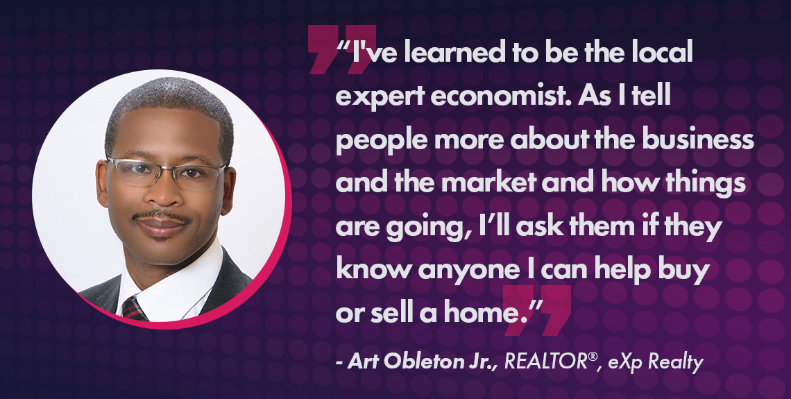 “Then what happens is those clients will ask me how things are going. At that point, I’ll tell them about the market and how my business is doing. I’ve learned to be the local expert economist. As I tell them more about the business and the market and how things are going, they’re hopefully feeling better about the market and themselves. Then I’ll ask them if they know anyone I can help buy or sell a home. What family members, friends or coworkers are looking to buy or sell a home.”