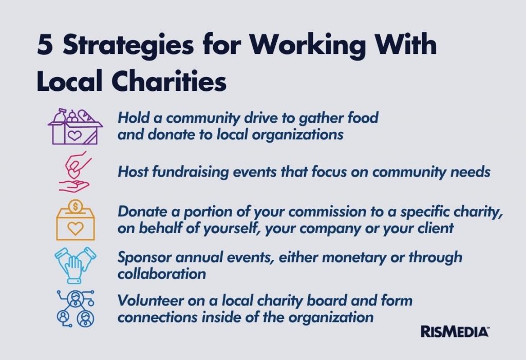 Working with local charities is not only a great way to give back to your community, but also demonstrate your commitment to the community and its residents. By building relationships with local charities and foundations, you will increase your visibility, improve your reputation as the go-to local expert, and open up valuable networking and partnership opportunities.
