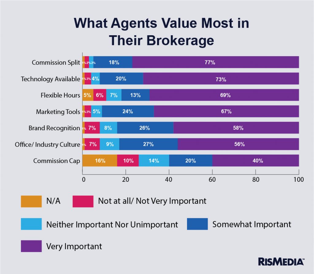 Office culture was also taken into account, with 56% citing it as “very important,” and 83% as at least “somewhat important.” When it comes to commission cap, only 40% cite it as “very important,” and 59% as at least “somewhat important.” Younger respondents (45%) are more likely to consider commission caps as “very important” compared to those 65-plus (37%).