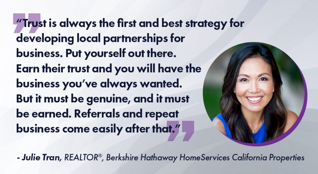 “Trust is always the first and best strategy for developing local partnerships for business,” says Julie Tran, a REALTOR® with Berkshire Hathaway HomeServices California Properties. “Put yourself out there. Earn their trust and you will have the business you’ve always wanted. But it must be genuine, and it must be earned. Referrals and repeat business come easily after that.”