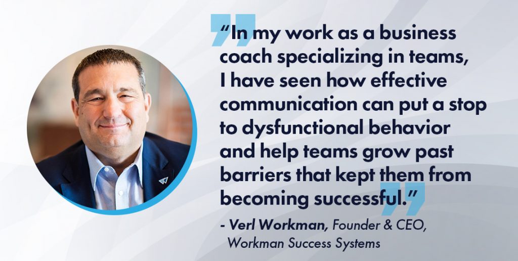 “In my work as a business coach specializing in teams, I have seen how effective communication can put a stop to dysfunctional behavior and help teams grow past barriers that kept them from becoming successful,” says Verl Workman, founder and CEO of Workman Success Systems.