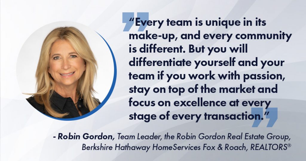 “Every team is unique in its make-up, and every community is different,” says Robin Gordon, leader of the Robin Gordon Real Estate Group with Berkshire Hathaway HomeServices Fox & Roach, REALTORS® in Philadelphia, Pennsylvania. “But you will differentiate yourself and your team if you work with passion, stay on top of the market and focus on excellence at every stage of every transaction.”