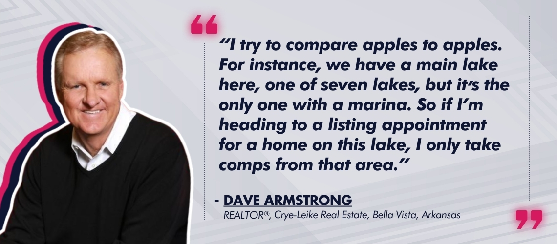 “I try to compare apples to apples,” states Dave Armstrong, a REALTOR® with Crye-Leike Real Estate, in Bella Vista, Arkansas. “For instance, we have a main lake here, one of seven lakes, but it’s the only one with a marina. So if I’m heading to a listing appointment for a home on this lake, I only take comps from that area. Other factors include the age of the home, size, number of beds and baths, location, amenities, general condition of the home, school district, etc.